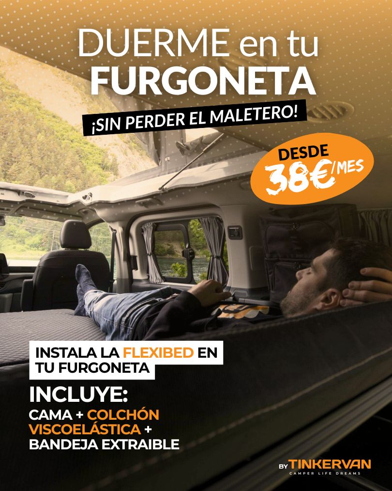 FLEXIBED es un sistema de cama camper profesional que se instala sin tocar la furgoneta, mantiene el maletero gracias a su bandeja extraíble y no requiere homologación.